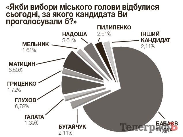 Це дає можливість припустити, що кременчужани будуть визначатися зі своїм вибором саме серед запропонованих ймовірних кандидатів. Але шанси останніх трьох кандидатів бути обраними на посаду міського голови є мінімальними, зважаючи на незначну кількість прихильників у порівнянні з показниками антирейтингу кожного з них.