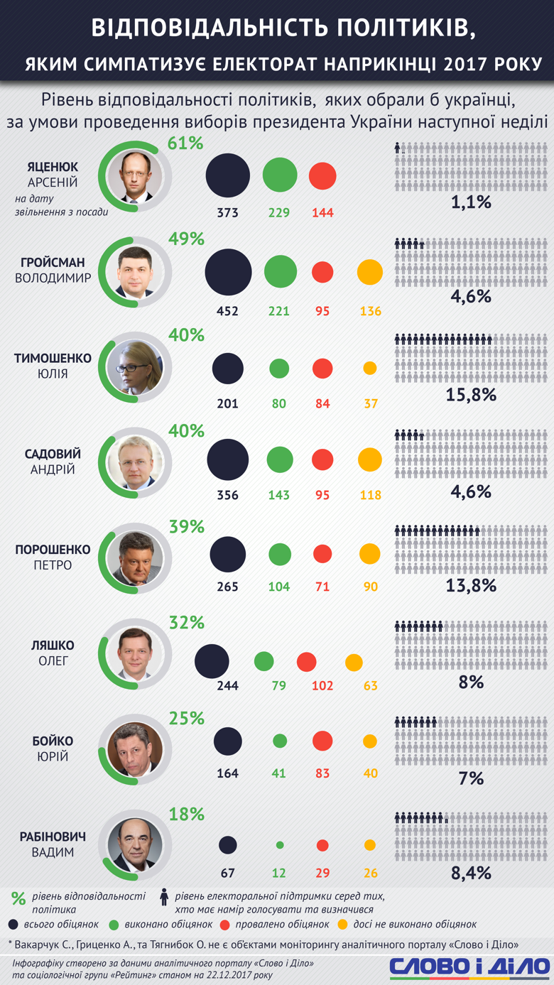 - За підрахунками «Слово і діло», на момент відставки з посади Прем’єр-міністра в квітні 2016 року Арсеній Яценюк встиг реалізувати 61% обіцяного, тобто 229 обіцянок. На другому місці – нинішній Глава уряду Володимир Гройсман, який виконав 49% обіцянок. Третю сходинку розділили народний депутат Юлія Тимошенко та міський голова Львова Андрій Садовий – 40% виконаних обіцянок. Президент України Петро Порошенко посів четверте місце в рейтингу, виконавши 39% обіцяного.