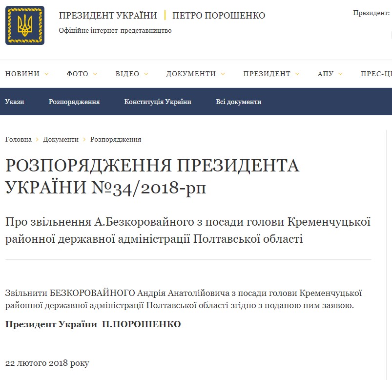 22 февраля Президент Пётр Порошенко подписал распоряжение об увольнении Андрея Безкоровайного с должности главы Кременчугской районной государственной администрации в связи с написанным им заявлением.