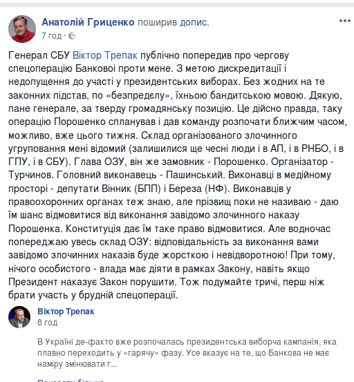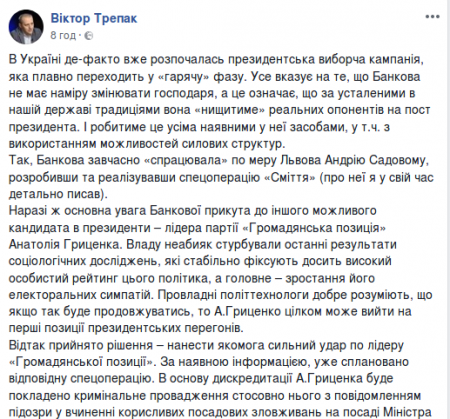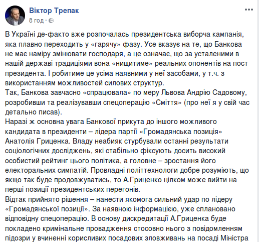 “В основу дискредитації Анатолія Гриценка буде покладено кримінальне провадження стосовно нього з повідомленням підозри у вчиненні корисливих посадових зловживань на посаді Міністра оборони (2005-2007 рр.). Підготовча робота вже проведена, зокрема «опрацьовано» майнові військові об’єкти (один з них – на Сході України), до яких буде зроблено прив’язку відповідних дій (рішень) Анатолія Гриценка як очільника Міноборони. І хоча по його діяльності у цій частині вже не один раз проходилися різні правоохоронні органи з метою знайти бодай щось, на цей раз потрібне буде «знайдено»,”- розповів Віктор Трепак.