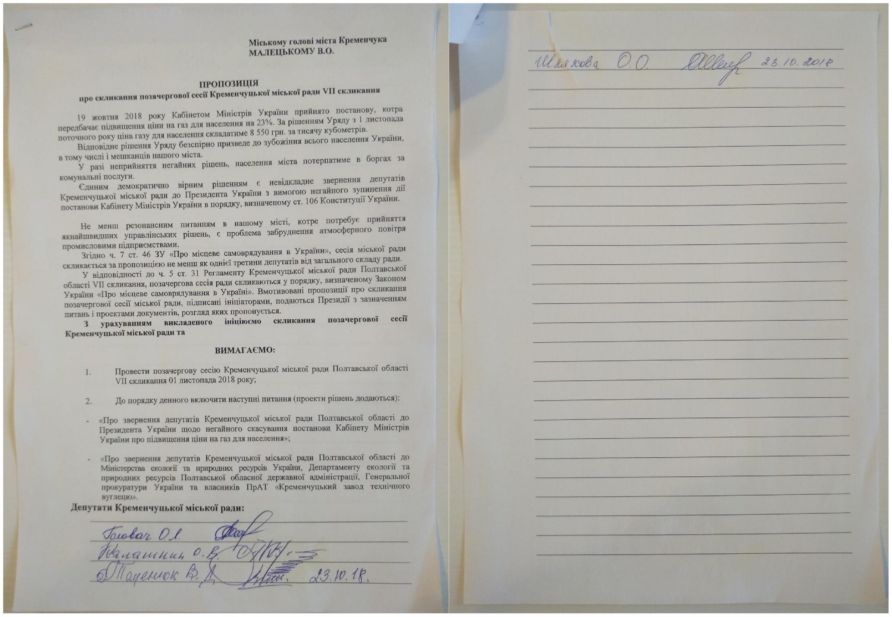 Олександр Головач пропонував провести позачергову сесію Кременчуцької міської ради 1 листопада і розглянути на ній ці два найболючіші на сьогодні питання. З 24 жовтня проводився збір підписів депутатів під відповідним зверненням. На жаль, сесія не відбулася, оскільки це звернення підтримали лише депутати партії «Батьківщина», підписів яких недостатньо для скликання позачергової сесії.