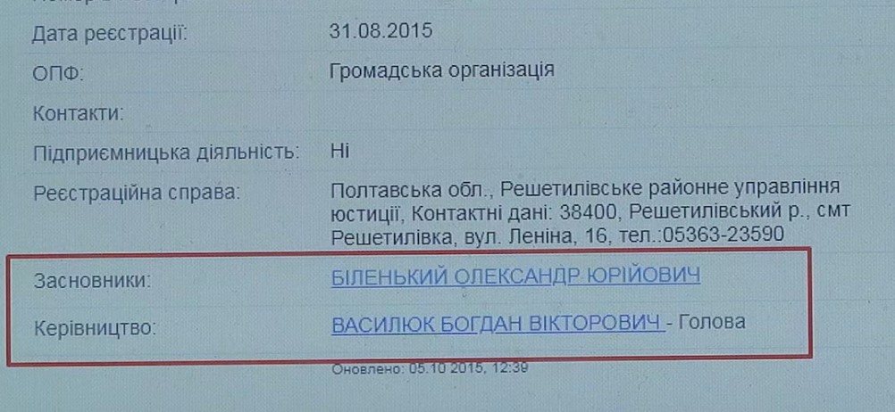Общественная организация зарегистрирована в Решетиловке Полтавской области, а среди её основателей – глава Полтавского областного совета Александр Биленький, который прошёл в облсовет по списку от Блока Петра Порошенко.