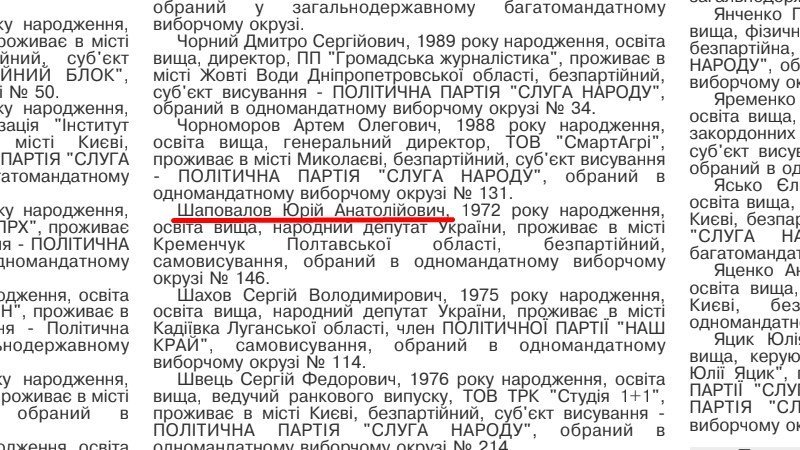 Самовыдвиженец Юрий Шаповалов набрал в своём 146-ом округе 27,08% голосов, опередив ближайшего конкурента Феликса Урина (23,26%) от партии «Слуга народа».