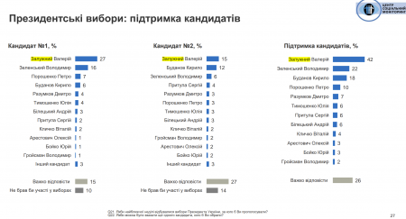 Друге місце тоді також було у чинного президента Володимира Зеленського. Його готові були підтримати 21,7% опитаних або 23,7% серед тих, хто піде на вибори.