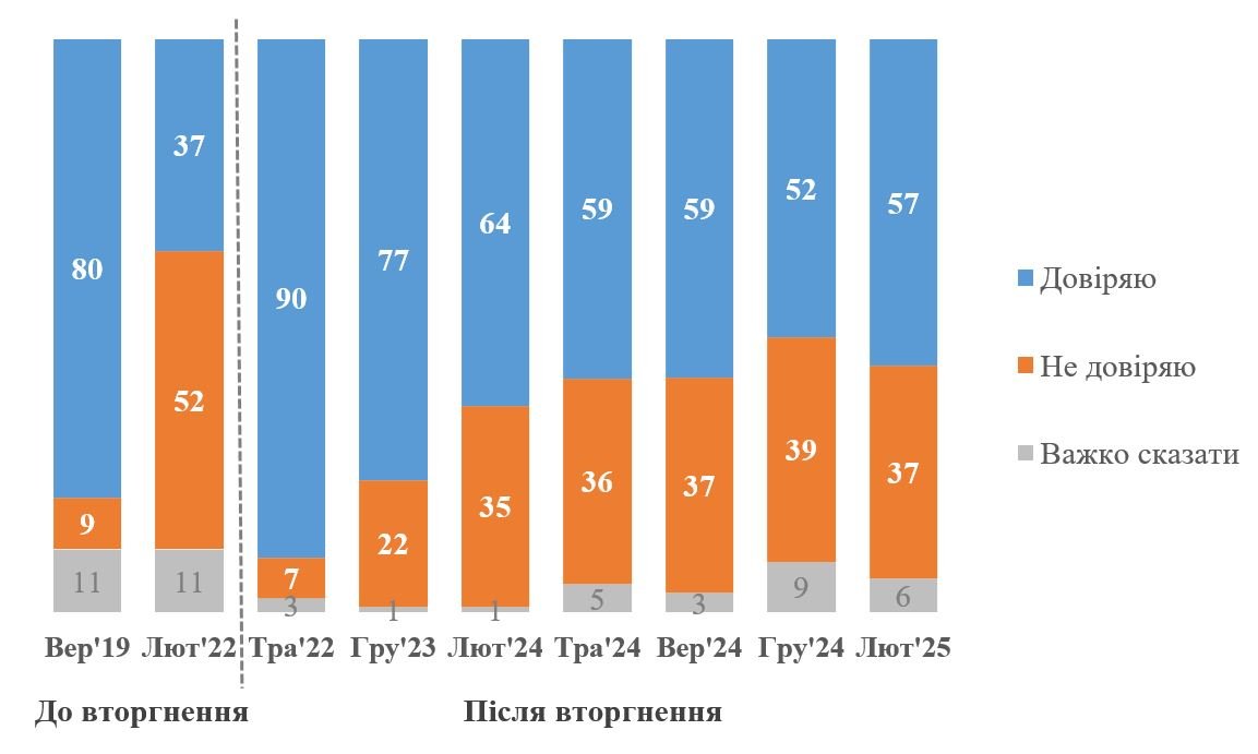 За даними КМІС показники довіри до президента помітно покращилися порівняно з останнім опитуванням, проведеним у грудні 2024 року, коли Зеленському довіряли 52% опитаних українців, а не довіряли — 39%. Тоді баланс довіри-недовіри становив +13%.