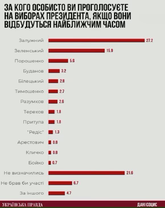 За Валерія Залужного готові проголосувати понад 27%, а за Петра Порошенка — 5,5%.