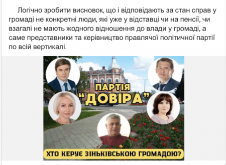 За підрахунками аналітиків, «Рідне місто» витратило майже 3,5 тисячі доларів на просування своїх дописів. У них партія критикує роботу Зіньківської міської ради, публікує зарплати посадовців і розповідає про випадки так званого «гречкосійства» представників інших політичних сил, зокрема партії «Довіра».