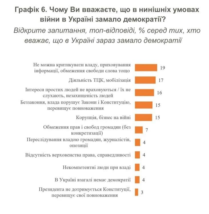 У КМІС зазначили, що про відсутність виборів говорили — 1%. Також інститут підкреслив: у перерахунку на все населення 6% — це ті, хто вважає, що демократії замало, і пояснює це діями ТЦК.