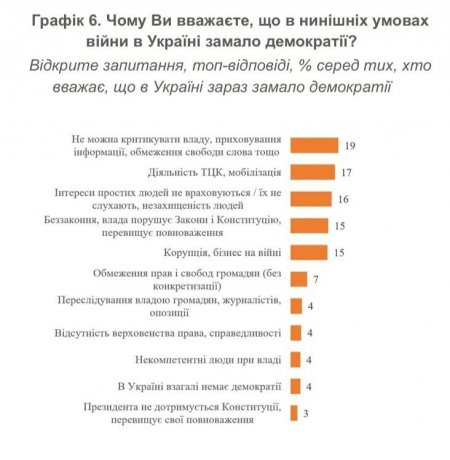 У КМІС зазначають, що найчастіше люди пов’язували брак демократії з неможливістю критикувати владу або обмеженням свободи слова (19%), діяльністю ТЦК (17%), тим, що інтереси простих людей не враховують або люди незахищені (16%), беззаконням, порушенням законів і перевищенням повноважень владою (15%), а також корупцією (15%).