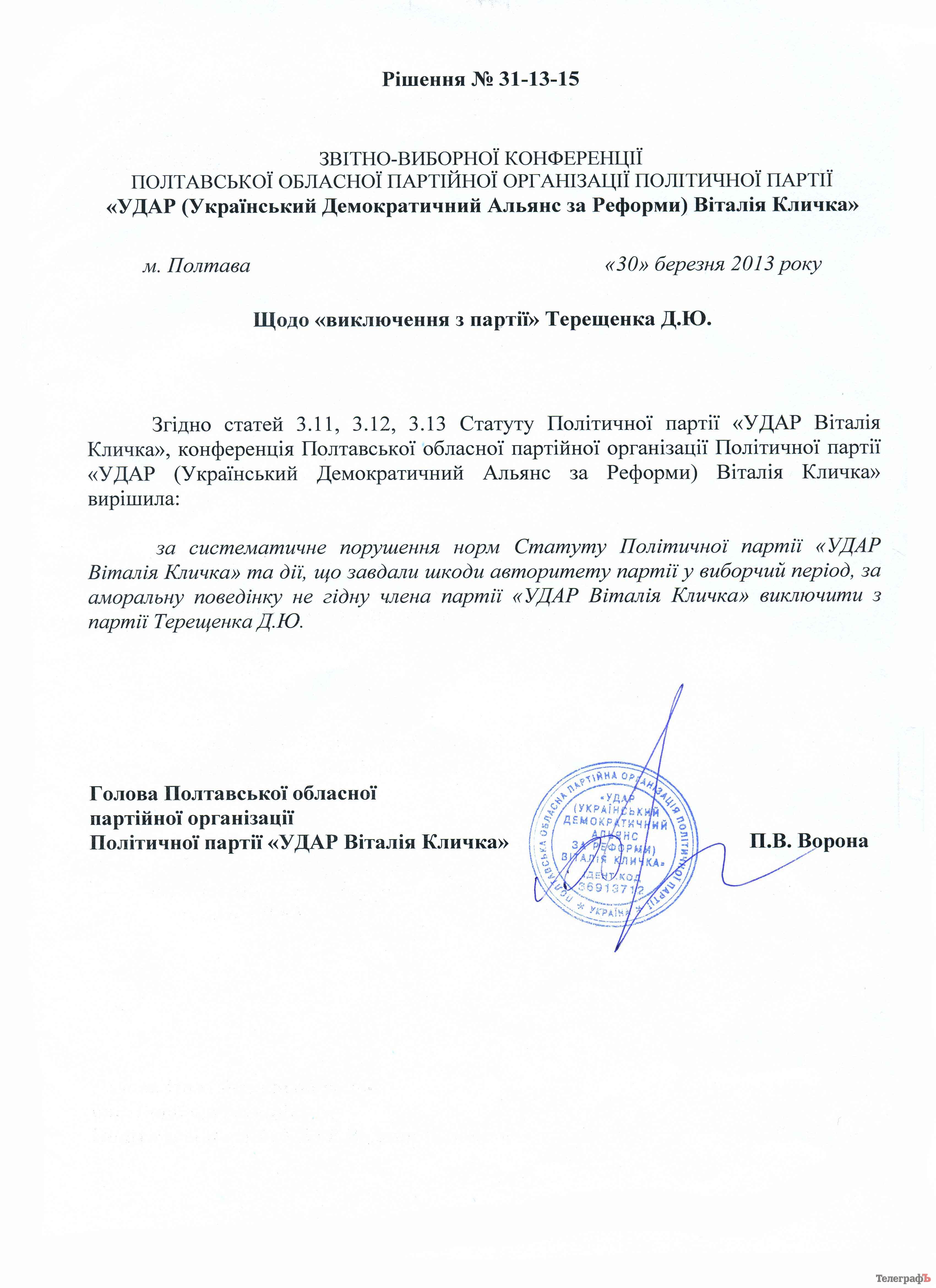 Согласно решения, Д.Терещенко исключили из партии за систематическое нарушение норм устава партии и действия, которые нанесли вред авторитету партии во время избирательного периода, за аморальное поведение, не достойное члена партии «Удар».