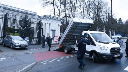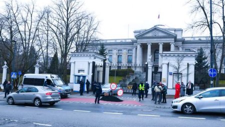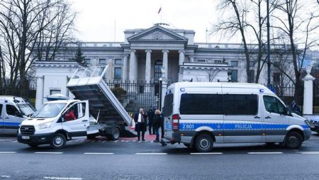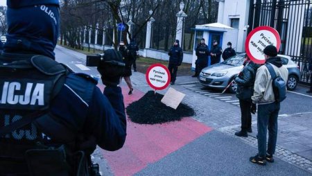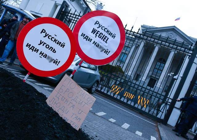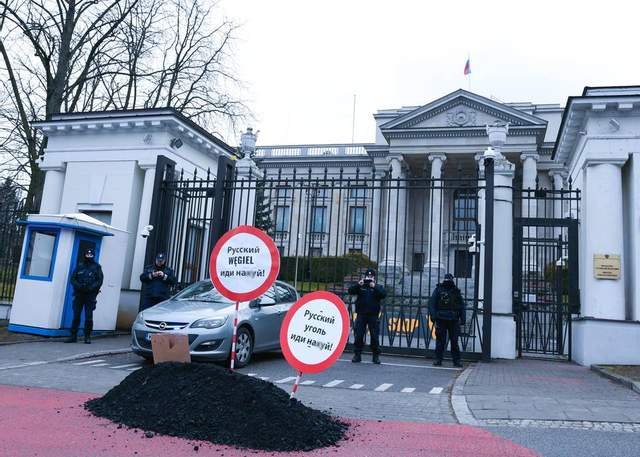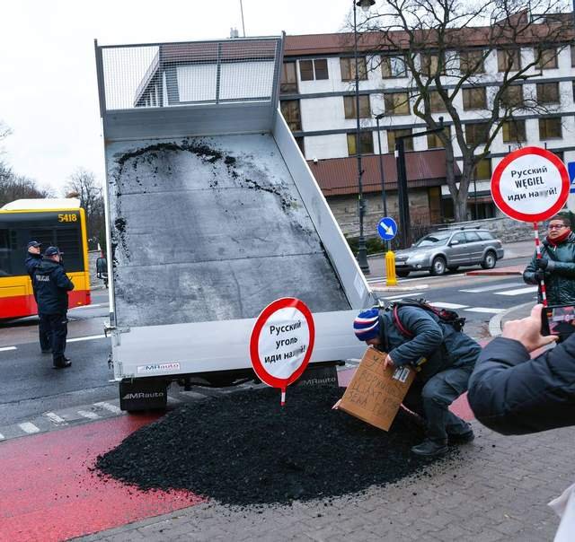 До посольства Росії у Варшаві польські активісти пригнали вантажівку і висипали з неї вугілля – так висловили своє ставлення до війни, яку розв’язав Путін в Україні. Учасники акції встромили у насип плакати польською і російською мовами з написами на кшталт «Російське вугілля, йди на**й».