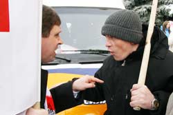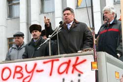 Волали протестанти від душі. Реформи і порядок ще й спецмегафони – ті, що виють – привезли. Мегафони вили. Широко відома у вузьких колах громадська діячка з захватом кричала: “Глухов, закрой рот!!!” (його, до речі, не було), “Киселёв, закрой рот!!!”, “Стасюк, закрой рот!!!” Треба розуміти, саме так пані представляє собі демократію. Вона (пані) так надсаджувалася, що “Телеграф” виніс її фото на першу сторінку (див. першу стор.) – народ має знати глашатаїв демократії в обличчя!