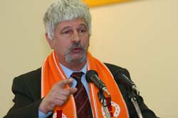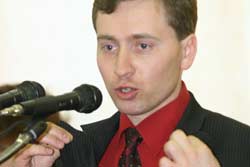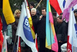 На передньому плані – знамена Партії „Реформи та порядок” (ПРП). У Кременчуці її очолює депутат міськради Корягін. Міський осередок партії створили всього три місяці тому – 19 грудня 2005 року. Якраз під вибори. Звичайно ж, за такий коротенький термін партія нічого значущого для міста не зробила.