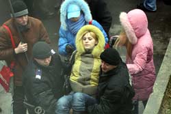Дівчині, яку партійці, разом з іншими, вивели на двогодинний мітинг, стало погано. Міліціонери несуть її до машини Партії „Реформи та порядок” – хто привіз, той має і відвезти.