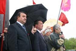 На фото зліва направо: пан Черниш – генеральний директор КрАСЗ та голова міського осередку Партії регіонів. Пан Черниш – фігура в місті відома і дуже небідна. Поруч з ним – молодий і теж небідний регіонал пан Семеняченко. А біля них, з мікрофончиком – вічний секретар кременчуцького міськкому компартії товариш Коцарь. Нині вони об’єдналися. І дружать тепер проти помаранчевих. Відбулася епохальна змичка буржуазії і пролетаріату. Ура, товариші!