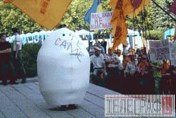 Поміж тим біля іншого входу до будівлі на урядовців чекав і невеликий «помаранчевий» натовп. Протилежний табір зустрічав кабмінівців саморобним яйцем з написом «Те саме, 2004» і дружно горлав «Ганьба!». Охороняли порядок під час «передвиборчо-виїзного» засідання Кабміну більше ста правоохоронців.