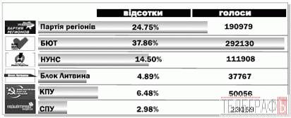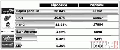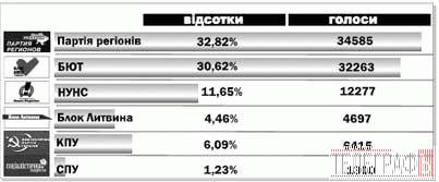 у восьми з дев’яти виборчих округів перемогу здобув БЮТ. У 144 окрузі (Кременчук, Комсомольск, Кременчуцький район) на першому місці Партія регіонів.