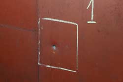 На місці події у правій половині нижньої частини дверей під’їзду правоохоронці виявили заглиблення діаметром 10 мм, можливе від удару кулі. Такі ж сліди є на бетонному перекритті під’їзду та на цегляному дашку.