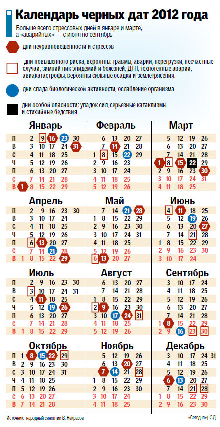 В 2012 году Украину и мир ожидает 51 «черный день». Об этом свидетельствует «календарь выживания», составленный народным синоптиком из Днепропетровска Валерием Некрасовым, сообщает Сегодня. В календаре ежемесячно выделяются даты, в которые наиболее вероятны природные катаклизмы и стихийные бедствия, аварии, травмы и несчастные случаи (см. инфографику).