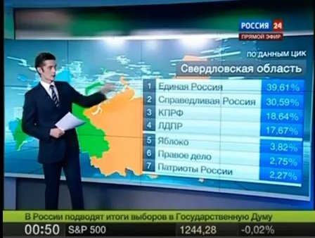 В России сразу на нескольких участках при обнародовании результатов ЦИК количество голосов превысило 100%. Так, телеканал Вести, передавая данные ЦИК в Свердловской области, насчитал 115,35% проголосовавших.
