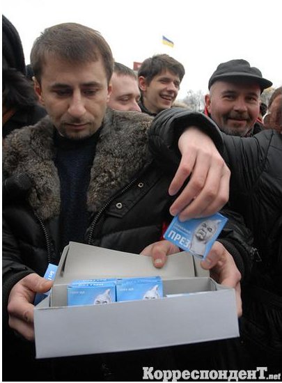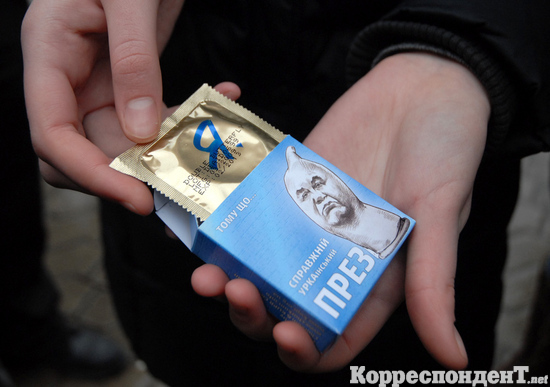 25 февраля в Киеве на Майдане Независимости раздавали презервативы с изображением Януковича. Акция, по информации организаторов, была посвящена второй годовщине правления В.Януковича. Всего собирались раздать полторы тысячи коробочек презервативов с надписью Настоящий УРКАинский през. Без ГМО. Половину отобрали правоохранители.