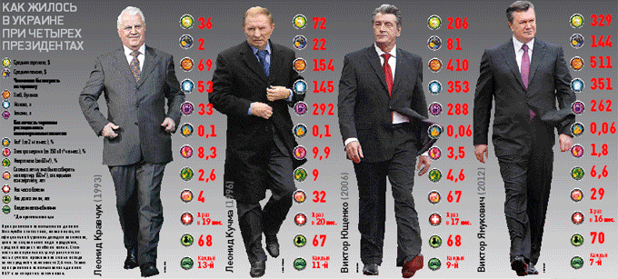 В специальном исследовании сравнивались показатели качества жизни второго года правления действующего президента с показателями второго года работы его предшественников. Так, в 2007 году при Ющенко на среднюю зарплату гражданин мог приобрести 410 буханок хлеба. В 2012-м этот показатель вырос до 511. В то же время, если 5 лет назад среднестатистический гражданин на месячную зарплату мог купить 353 литра молока, то сейчас 351. Ситуация с бензином — хуже. При Ющенко на среднюю зарплату можно было заправить 288 литров, при Януковиче — 262.