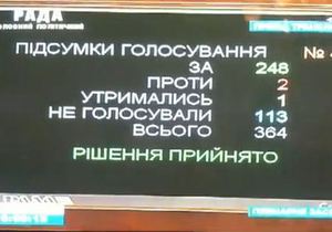 Услышав название этого документа, депутаты фракции БЮТ-Батьківщина и НУ-НС ринулись в президиум, чтобы не дать возможности Мартынюку объявить голосование по этому вопросу. Поскольку в зале стоял крик, то первое голосование не набрало необходимого количества голосов. Второе голосование было результативным - 248 голосов "за".