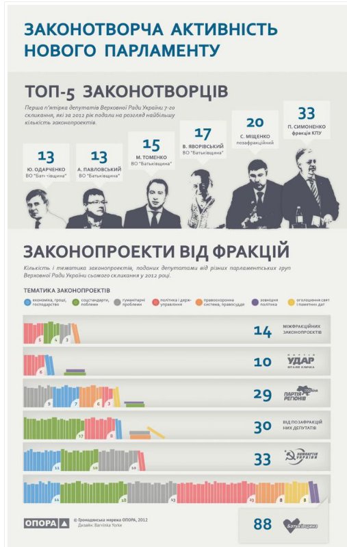 Лидером рейтинга стал лидер фракции КПУ Петр Симоненко, который успел предложить уже 33 законопроекта. Также в пятерку самых активных попал внефракционный депутат Мищенко, у которого на счету 20 законопроектов. Примечательно, что все последующие места рейтинга достались депутатам от ВО Батьківщина, а именно Яворивскому, Томенко, Павловскому и Одарченко.