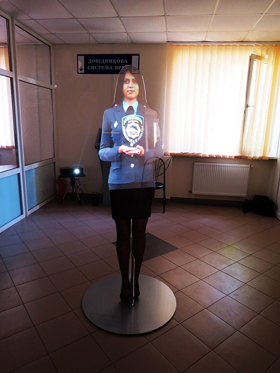 Голографическая фигура женщины встречает посетителей в отдела регистрационно-экзаменационной работы