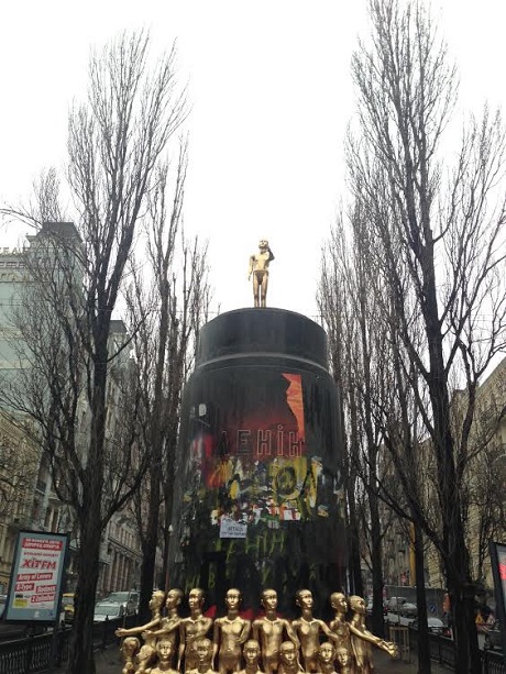 В Киеве к постаменту на Бессарабке, на котором раньше стоял Ленин, принесли 100 золотых детей, сообщает Украинская правда.