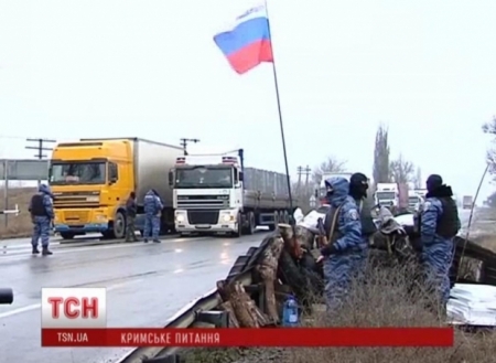 18.30 Дороги в Крым перекрыли вооруженные боевики с российскими флагами на рукавах. Неизвестные убеждают, что защищают полуостров от "фашистов".