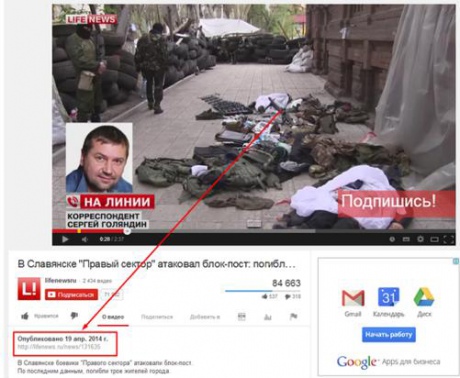 Російський телеканал Lifenews, який висвітлює події на Сході України з позиції лояльності до сепаратистів, завантажив відеосюжет про стрілянину у Слов'янську, яка сталася у ніч проти 20 квітня, ще напередодні - 19 квітня. Про це свідчить час завантаження відео на блозі телеканалу у Youtube. У відеосюжеті кореспондент, з яким зі студії зв'язуються телефоном (тобто не видно, де він насправді перебуває), розповідає, що події у Слов'янську на блок-посту відбувалися "близько першої - пів на другу ночі". За даними українського МВС, стрілянина почалася о 02:20 вночі проти неділі, 20 квітня.