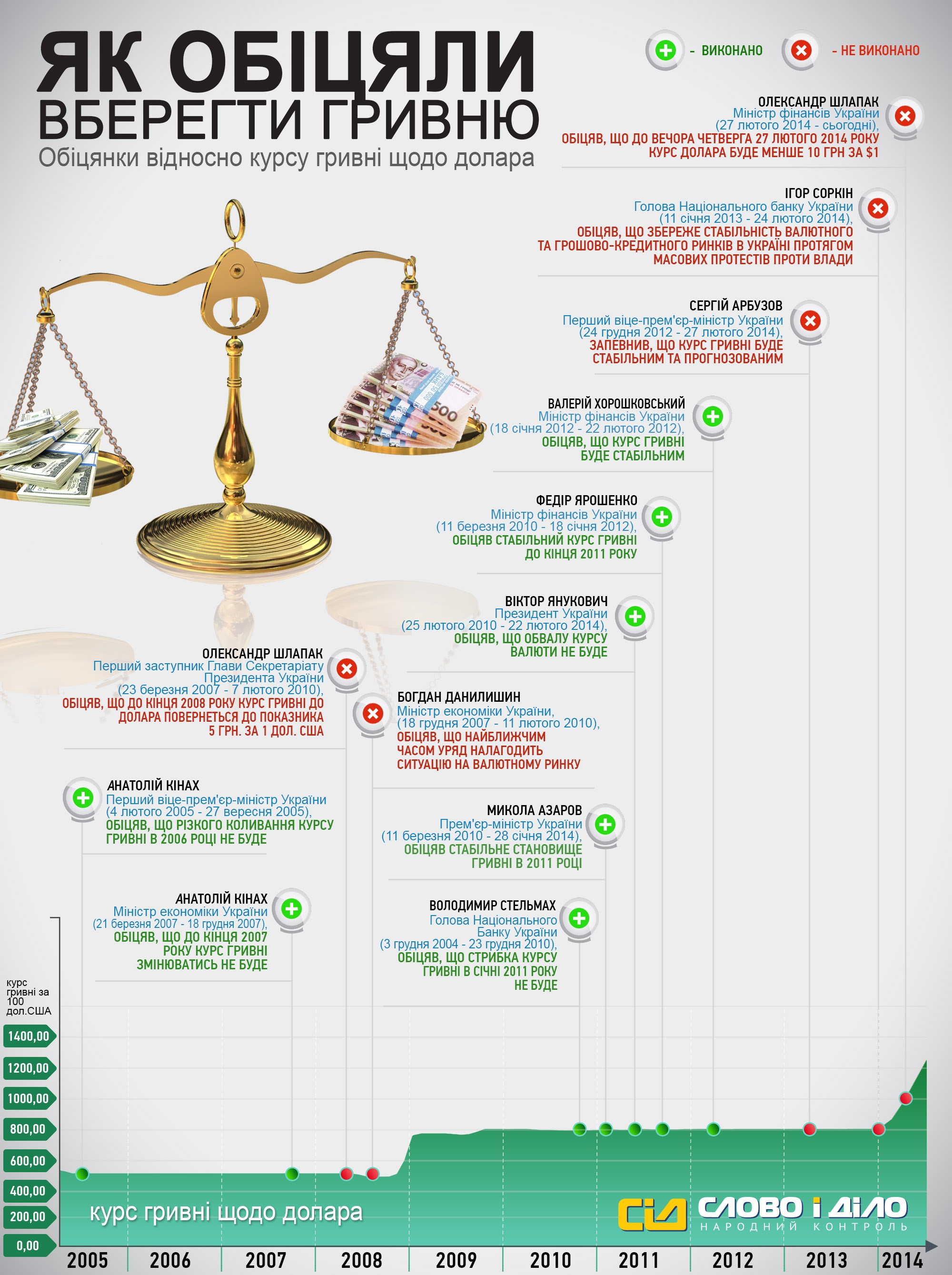 Станом на 15 квітня в системі «Слово і Діло» зафіксовано 35 обіцянок, які стосуються курсу національної валюти. Майже всі обіцянки, які свого часу заявляли тодішні міністри економіки та фінансів, прем’єр-міністри та президент, були висловлені в оптимістичному тоні. Усі політики заявляли, що обвалу гривні в найближчий час не буде. Проте не всім їхнім заявам судилося стати правдою.