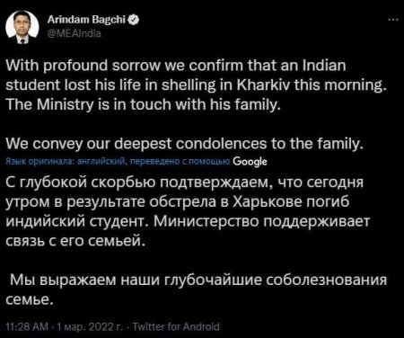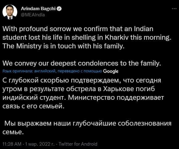 Під час обстрілу Харкова загинув громадянин Індії, який навчався у цьому місті. Про це повідомив спікер Міністерства іноземних справ Індії Аріндам Багчі у Twitter.