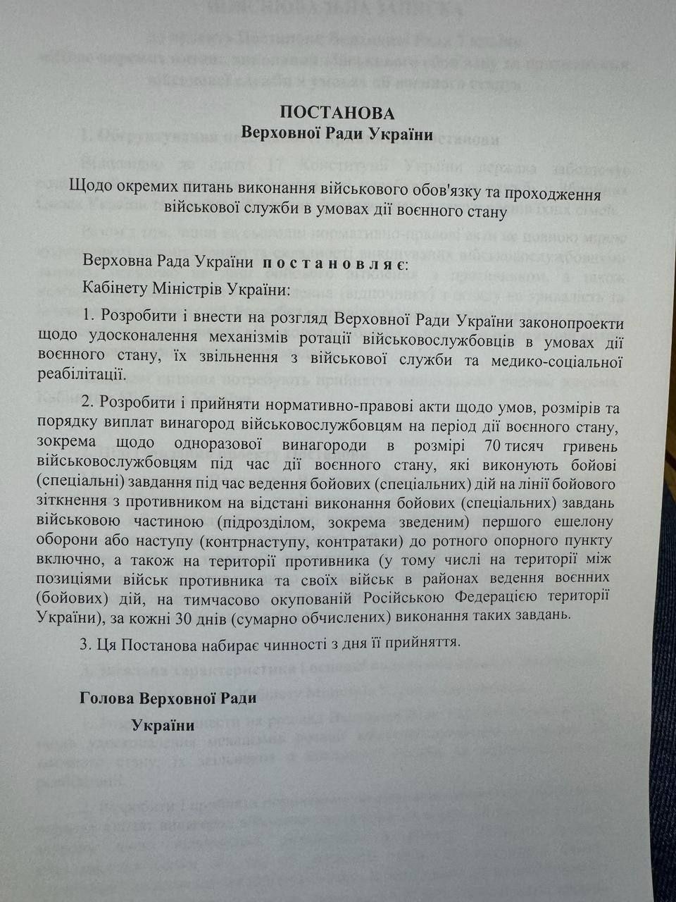 Парламент підтримав постанову, яка зобов'язує уряд виділити додаткову одноразову виплату в 70 тисяч гривень військовим на передовій та розробити законопроєкт про ротацію. Про це у телеграм-каналі повідомив нардеп Ярослав Железняк.