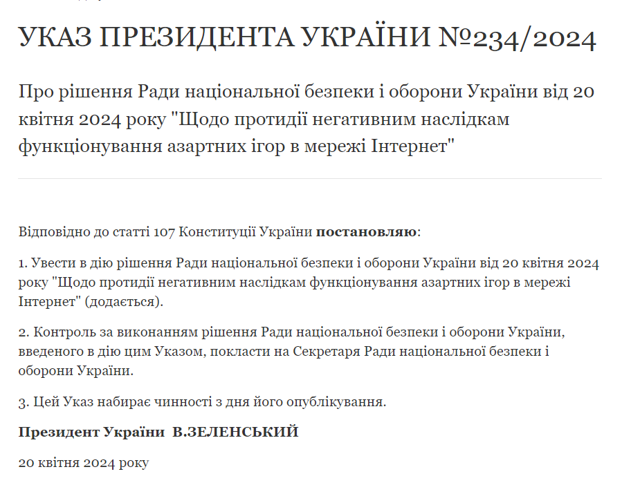 20 квітня Володимир Зеленський підписав рішення РНБО про обмеження онлайн-казино, йдеться на сайті Президента України.