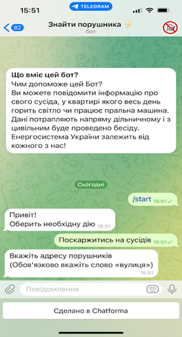 А ще в ТГ з’являються групи на кшталт «Знайти порушника». Створюються начебто для збору інформації про тих, хто, можливо, незаконно користується електроенергією під час відключень. І кожен громадянин, у якого немає світла, може надіслати боту дані про сусіда, в якого електрика є попри загальне відключення.