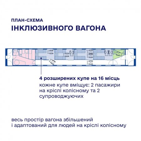 Працівники «Укрзалізниці» зазначають, що у вагоні буде 4 окремі купе. У кожному з них зможуть зручно подорожувати дві людини на кріслах колісних та їх супроводжуючі. Проєктуватимуть та виготовлятимуть вагон у співпраці з громадськими організаціями та людьми, для яких цей вагон і створюватиметься.