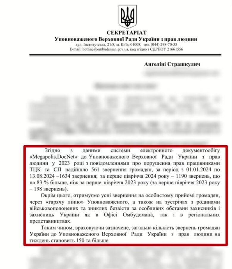 У 2024 році кількість скарг українських громадян на порушення їхніх прав співробітниками територіальних центрів комплектування та соціальної підтримки (ТЦК та СП) різко зросла. Про це свідчать дані, оприлюднені офісом Уповноваженого Верховної Ради з прав людини Дмитра Лубінця у відповідь на запит «Української правди».