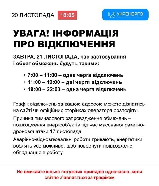 У четвер, 21 листопада, графік погодинних відключень (ГПВ) застосовуватимуть з 7.00 до 22.00. Відключати електроенергію будуть в одну та дві черги.