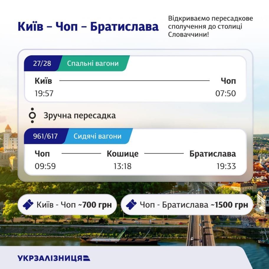 Маршрут з Києва до Братислави, столиці Словаччини, забезпечуватимуть поїзд №27/28 Київ — Чоп — Київ та новий поїзд словацької залізниці №617/961 Чоп — Братислава — Чоп.