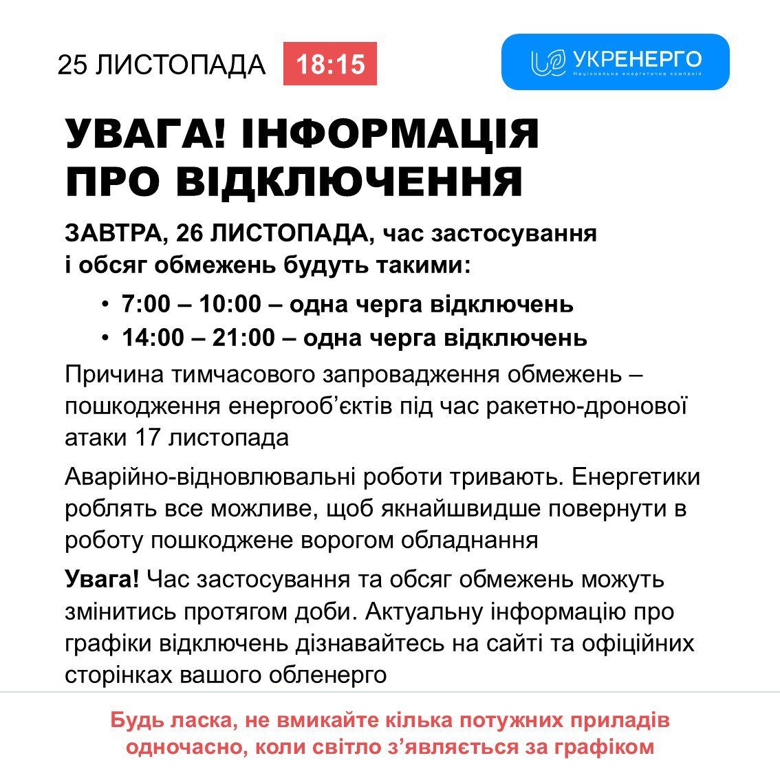 У вівторок, 26 листопада, графік погодинних відключень (ГПВ) застосовуватимуть з 07.00 до 10.00 та з 14.00 до 21.00. Відключати електроенергію будуть в одну чергу.