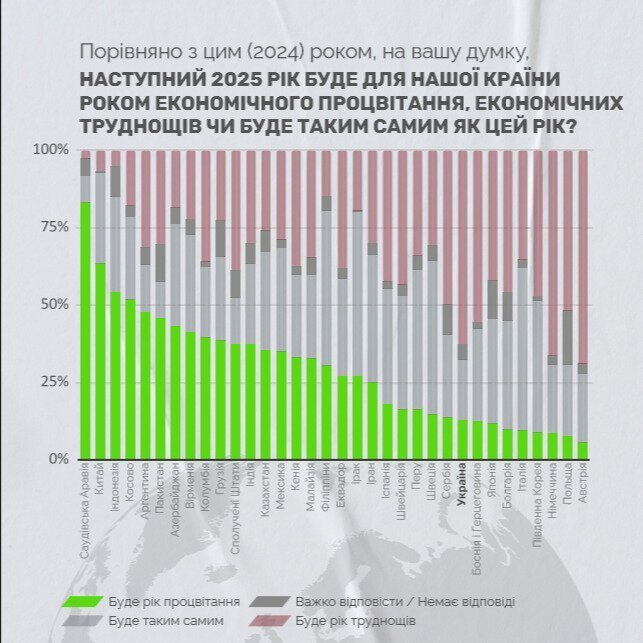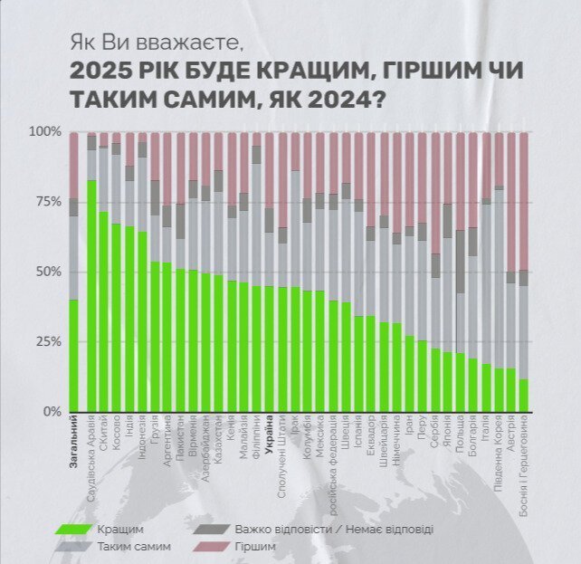 На глобальному рівні Україна займає 15-те місце серед країн з найбільш позитивними очікуваннями від 2025 року. У трійці лідерів — Саудівська Аравія, Китай та Косово. Втім, попри війну, у порівнянні з іншими країнами Східної Європи українці залишаються оптимістами, адже Україна займає перше місце в рейтингу за індексом на рівні +17%, тоді як інші країни регіону мають негативні значення цього індексу: у Польщі -14%, у Болгарії -15%, у Сербії -21%, у Боснії та Герцеговині -38%.