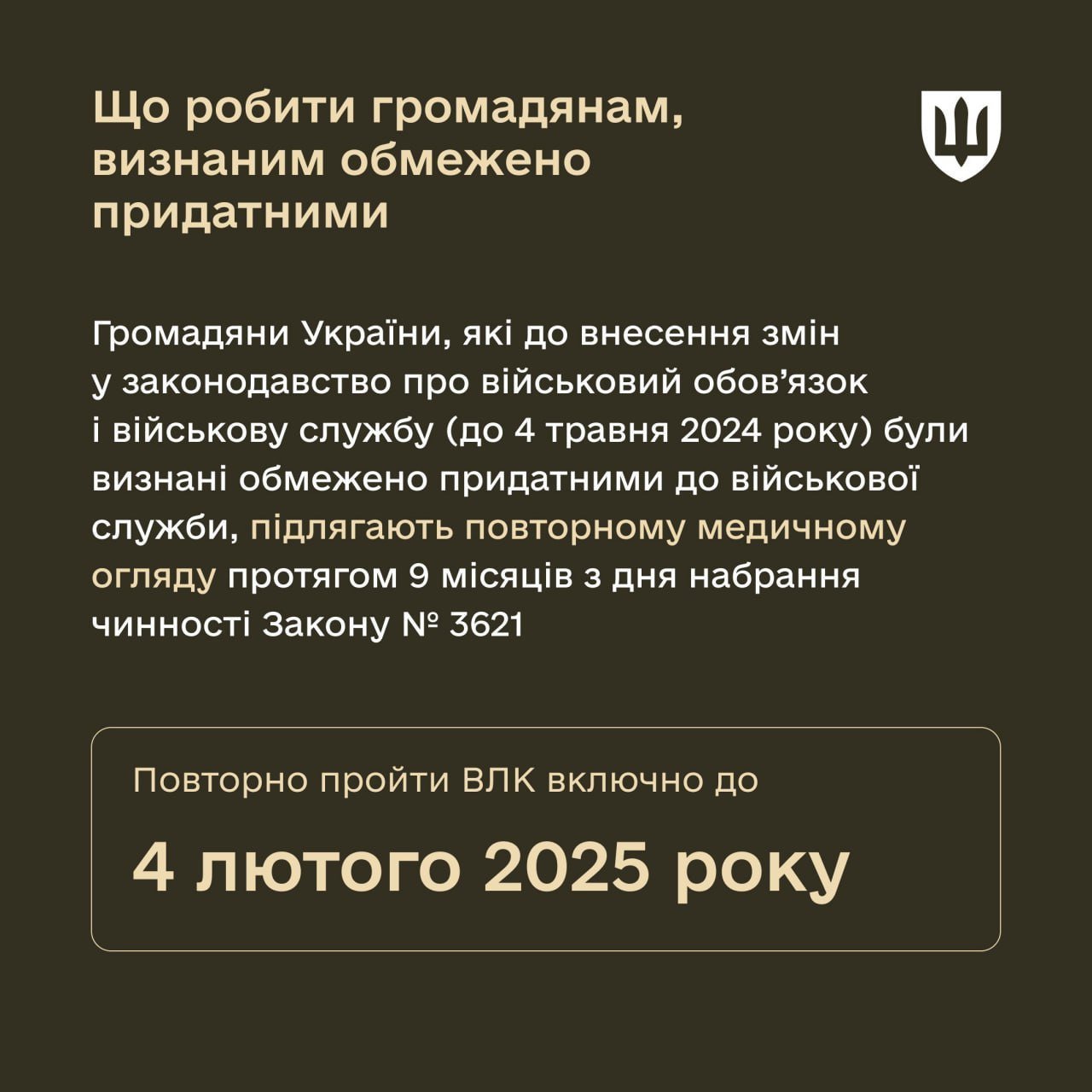 Усі громадяни України, які до 4 травня 2024 року були визнані «обмежено придатними» до військової служби, в термін по 4 лютого 2025 року підлягають повторному медичному огляду з метою визначення придатності до військової служби.
