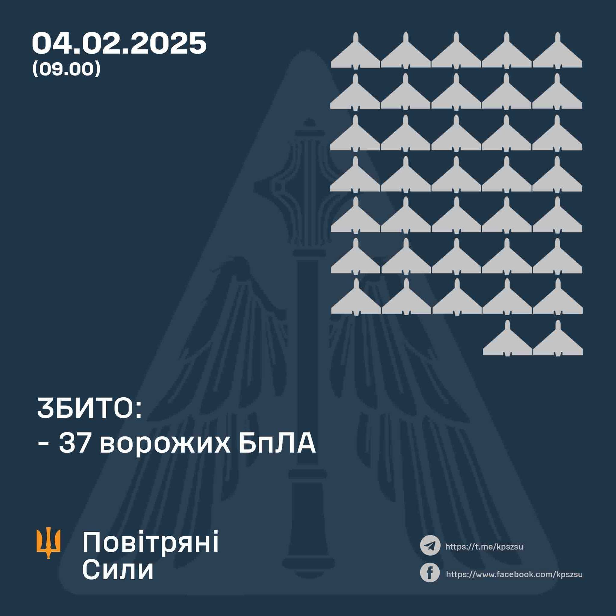 Станом на 9.00 підтверджено збиття 37-ми ударних БпЛА типу Shahed та безпілотників інших типів у Полтавській, Сумській, Київській, Чернігівській та Черкаській областях.