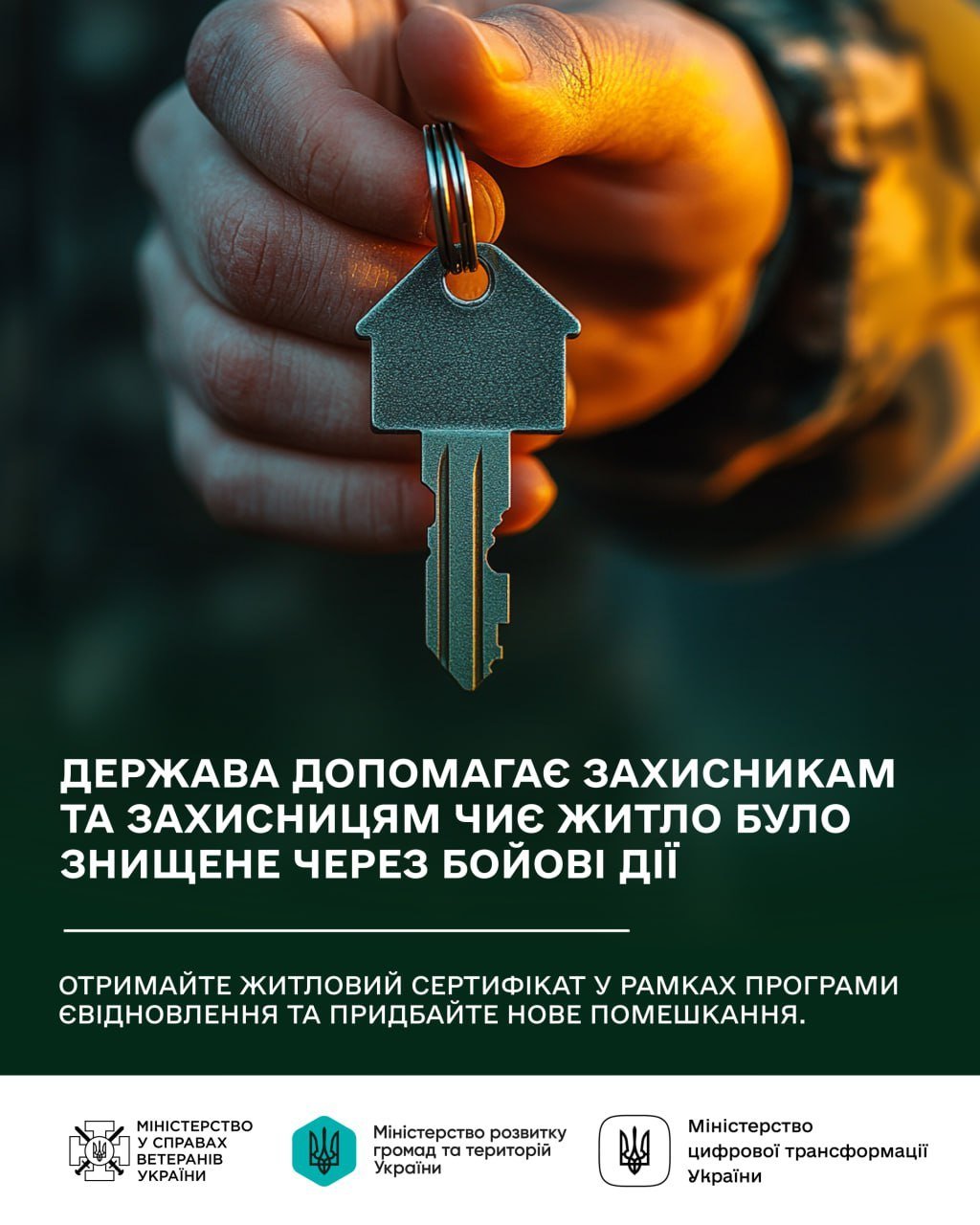 Держава допомагає тим, хто втратив домівку через російську військову агресію та надає можливість отримати житловий сертифікат за який можна придбати нове житло. Пріоритетною групою є ветерани війни та військовослужбовці.