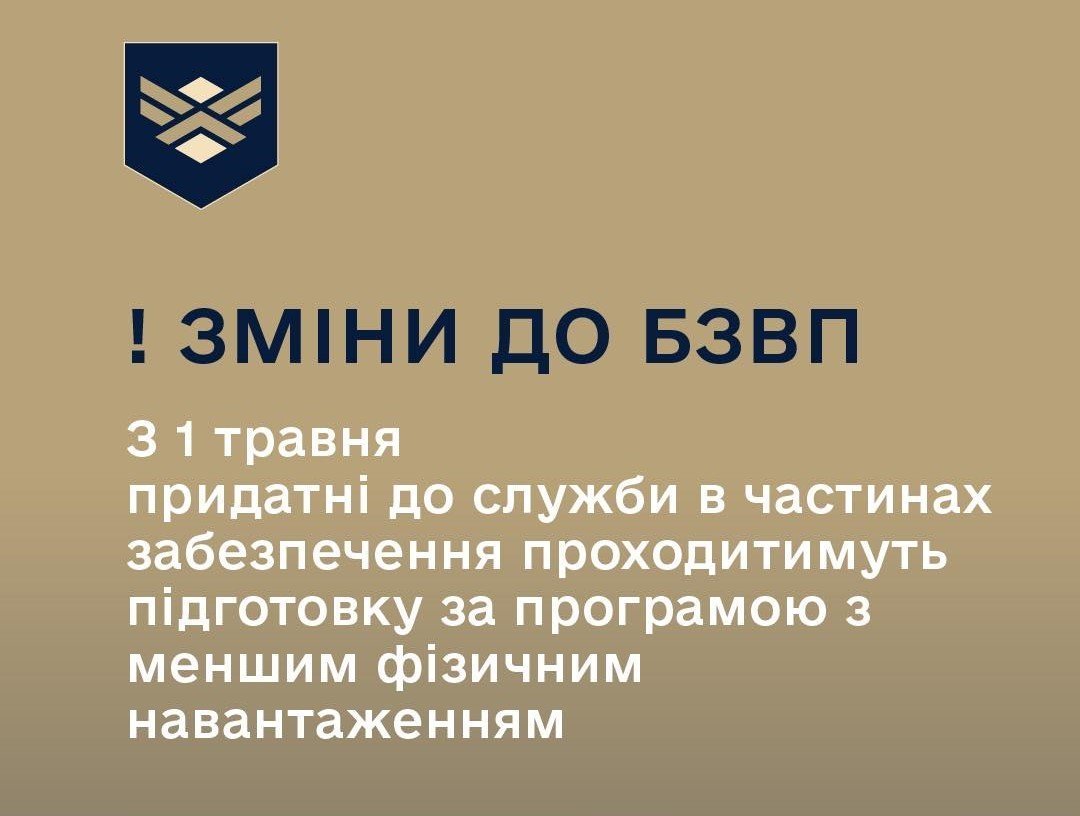 У ЗСУ розробили зміни до програми базової загальновійськової підготовки (БЗВП), які зменшать навантаження на військовослужбовців, придатних до служби в частинах забезпечення, підрозділах охорони, ТЦК і СП, вищих військових навчальних закладах, навчальних центрах, установах, медичних підрозділах, а також підрозділах логістики, зв’язку та охорони. Про це 15 квітня повідомив Генеральний штаб ЗСУ.