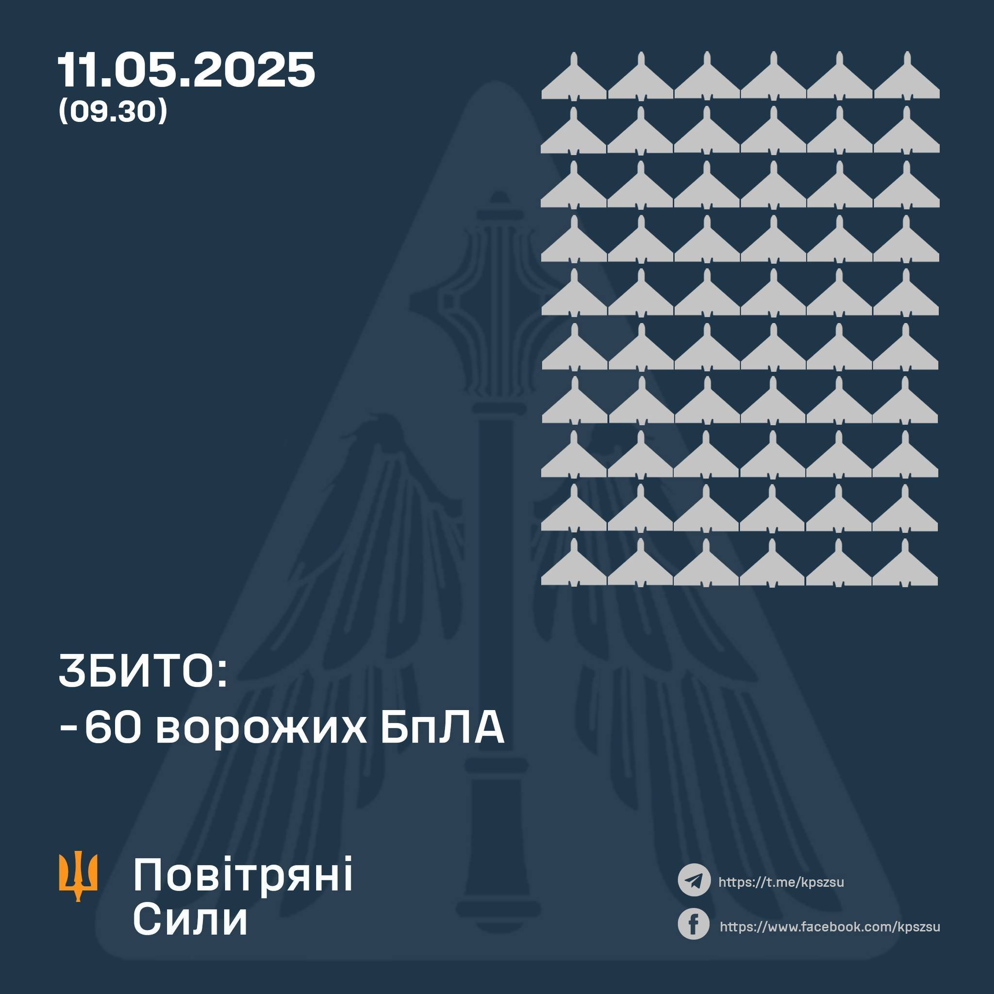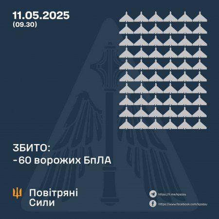 Станом на 09.30 підтверджено збиття 60 ударних БпЛА типу Shahed (безпілотників інших типів) на сході, півночі, півдні та в центрі країни.