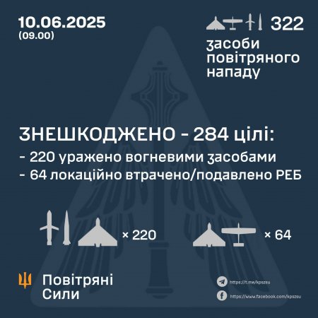 У ніч на 10 червня (із 22.00 9-го червня) російські війська атакували Україну 322-ма засобами повітряного нападу. Про це повідомила пресслужба Повітряних сил України.