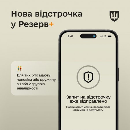 В оновленому застосунку «Резерв+» зʼявилася відстрочка для подружжя, в якому чоловік або дружина мають інвалідність І або II групи. Про це повідомила пресслужба Міністерства оборони України.